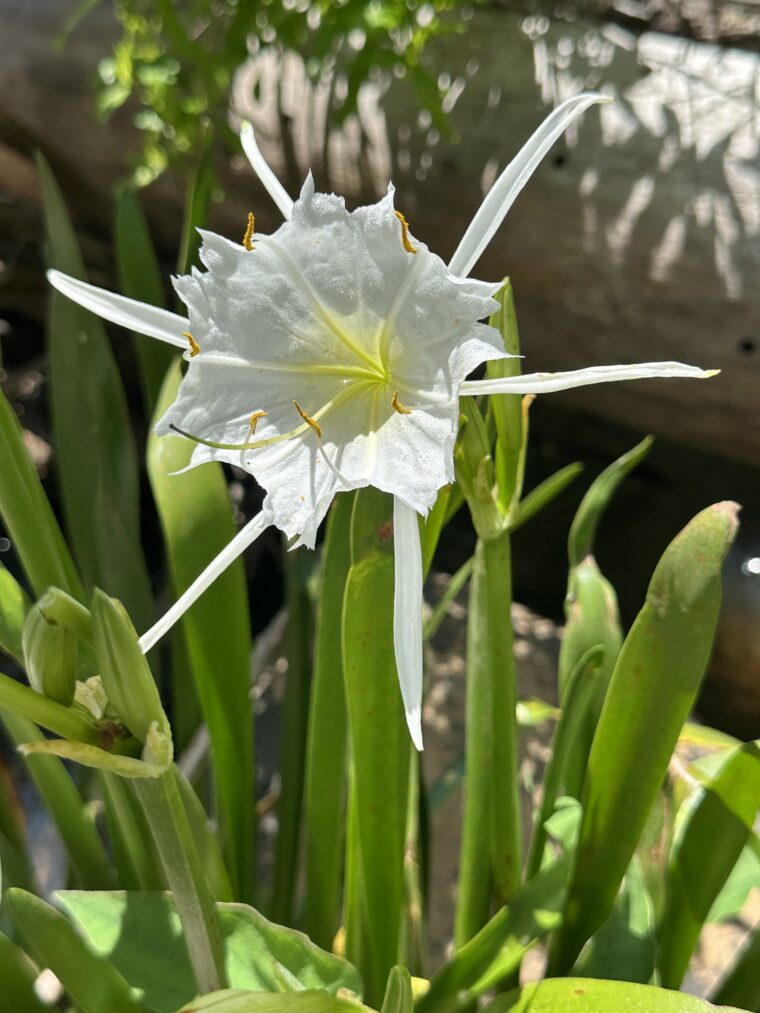 While in the area, we stopped to see a thriving population of Hymenocallis coronaria (shoal lily) pictured above, growing in Flat Shoals Creek—a nearby tributary of the Chattahoochee River. Shoal lilies live in shallow moving water, where their bulbs can take hold among rocky crevices in the creek bottom. It was mesmerizing to see them blooming in huge drifts across the creek while listening to the water babble over the exposed shoals. This lily is found only in Georgia, Alabama, and South Carolina. Its numbers have decreased significantly due to the construction of dams that alter waterway ecology. You can see a related species—Hymenocallis occidentalis—blooming in early summer in the Atlanta History Center’s Quarry Garden near the pond.
