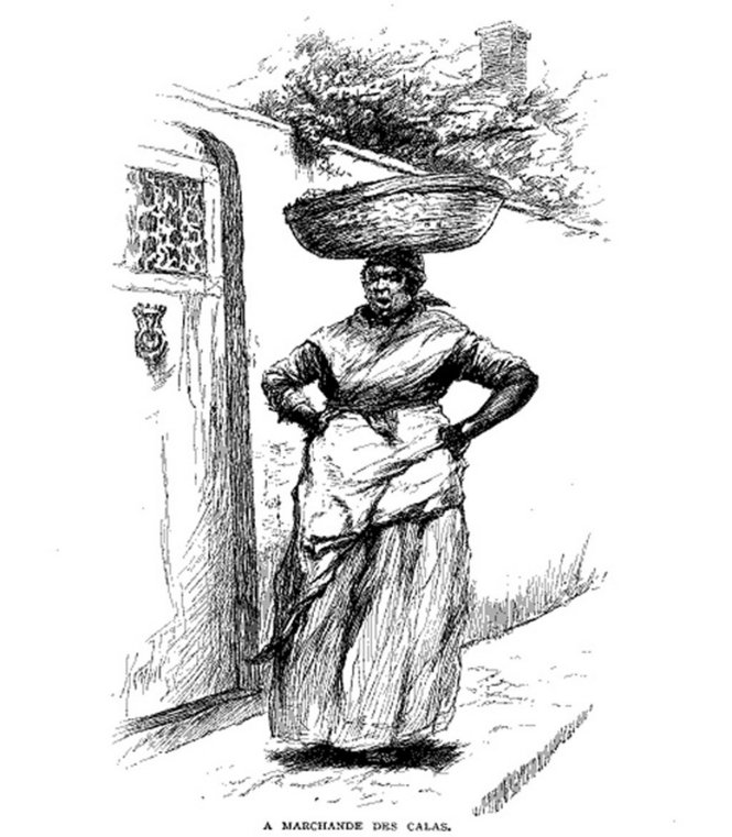 Typically depicted wearing tignons, flowing dresses, and white aprons, cala women were seen and heard throughout the French Quarter. With coal-heated braziers and baskets balanced atop their heads, each rice fritter they sold carried the legacy of West African food culture. Today, it is sometimes hard to find calas, but new efforts aim to ensure that their origin story, and the work of enslaved women who preserved their foodways, are not lost.