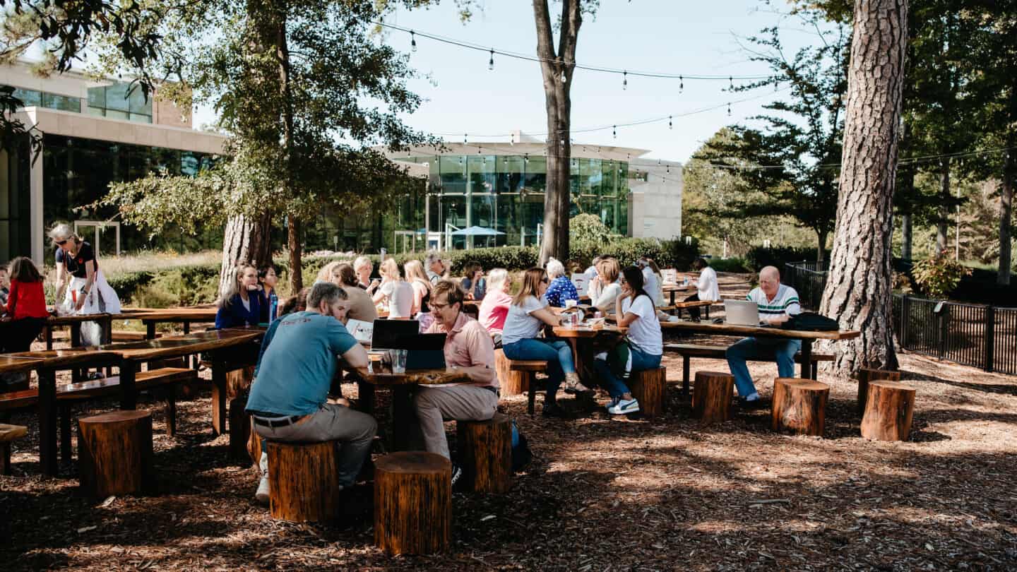 Woodworker Kirk McAlpin III spent seven months carefully crafting the table tops and benches, which span 60 x 30 feet. The result is a functional crown jewel of the Entrance Gardens.