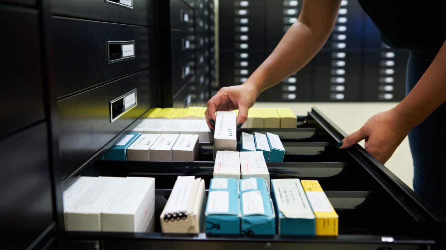 Please remain seated at a table designated by reference staff to view collection materials. You are allowed to pull one folder at a time from a box. Folders must be removed from boxes to view their contents. Records should always lay flat in their folders and be fully supported on tables when being viewed by patrons.