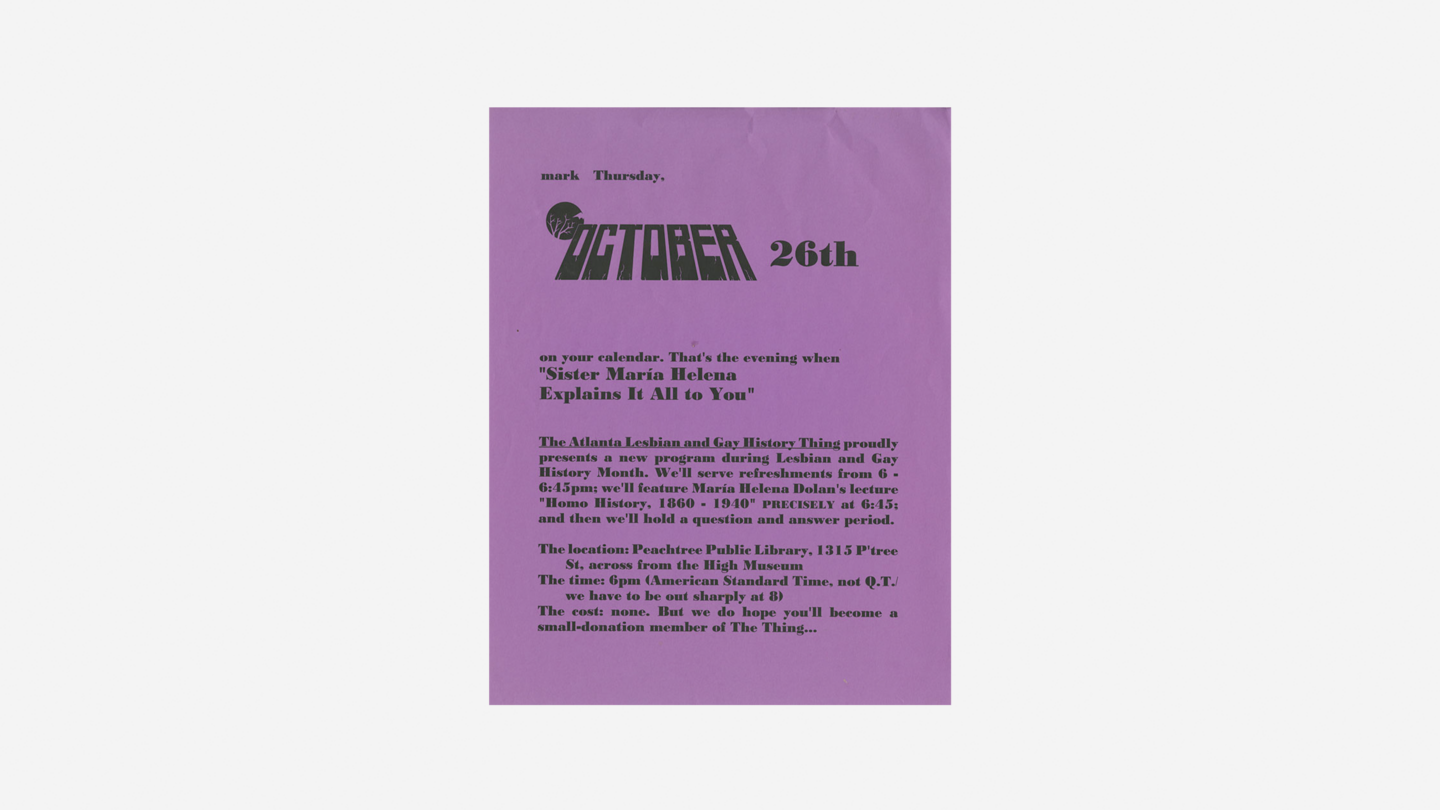 This collection contains materials collected by Maria Helena Dolan that document her work in LGBTQ+ and feminist organizations, her personal life, events she attended, her work at MARTA, as well her various other interests, including gardening, arts, and travel.