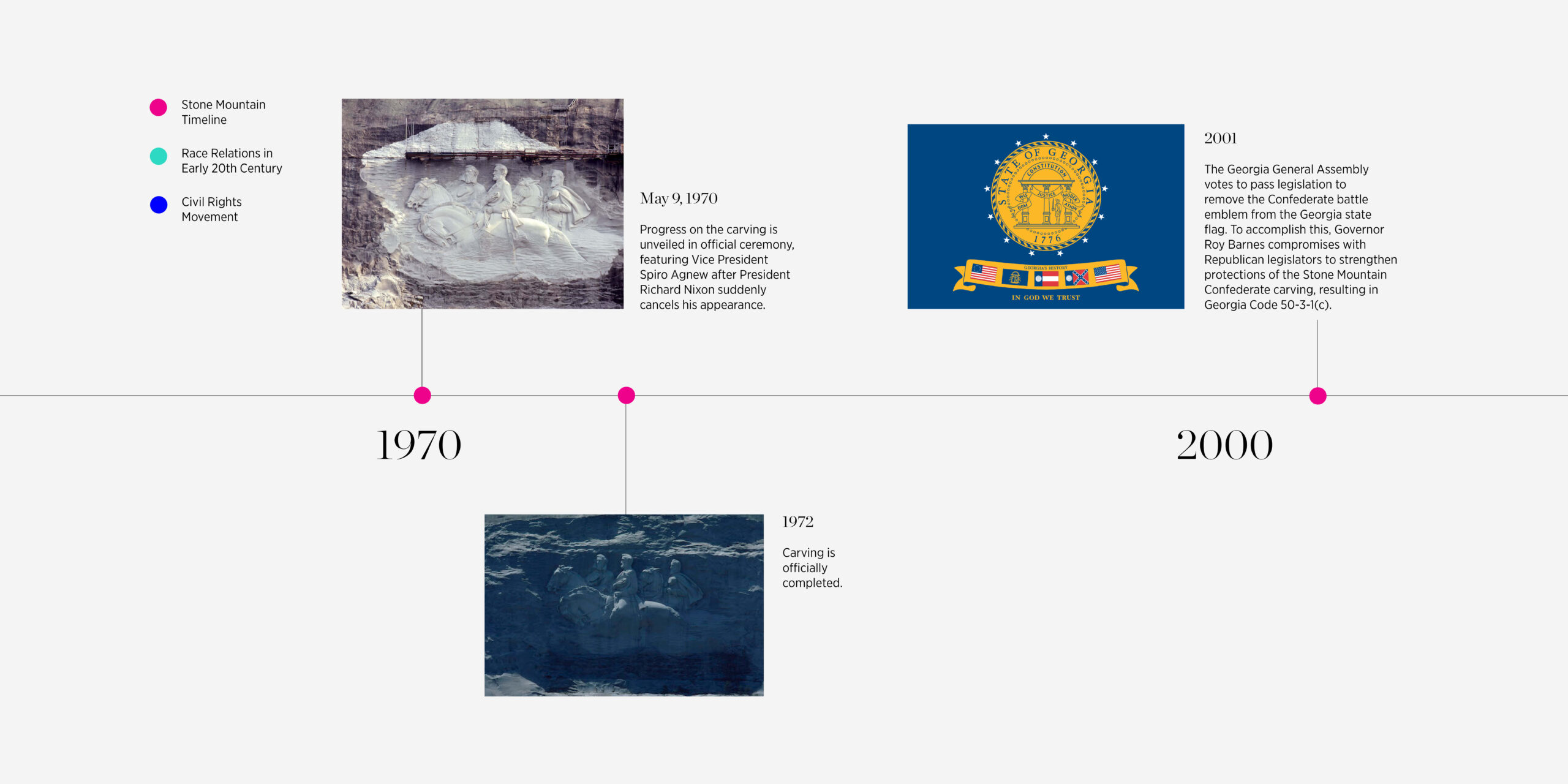 In 2001, Governor Roy Barnes began efforts to change the state flag, which had featured a Confederate battle emblem since 1956. As a part of the compromise with state legislators to remove the Confederate Battle emblem, the legislature amended Georgia Code 50-3-1 (c) to include protection for the Stone Mountain carving specifically. This law also includes text which references Lost Cause mythology.