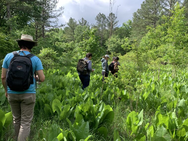 This spring the team explored a remnant of the Coosa Valley Prairies, a unique land formation in Northwest Georgia. We had Malcolm Hodges as a guide for the trip, whose curiosity and passion for plants, birds, and lichens is contagious. He led the group through patches of both wet and dry prairies on a Nature Conservancy held conservation easement owned by a logging company. The calcareous bedrock, which contains lime, influences the plant species found here. These plant communities are rare in Georgia but have similarities to prairies found further West. Each June in the dry prairie, large fields of prairie coneflowers and blazing stars bloom en masse. We saw Asclepias viridiflora (green milkweed), many native grasses, and swaths of wild quinine and phlox. In the wet prairie, hundreds of Silphium terebinthinaceum (prairie dock) surrounded us. As planting designers and horticulturists, we pondered how we might convey the immersive feeling of this landscape into a smaller garden space.