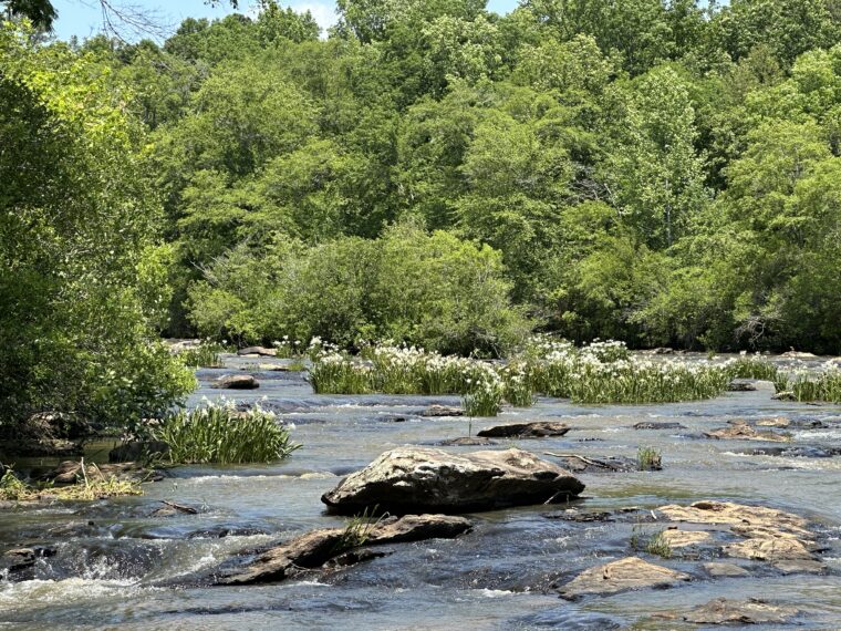 While in the area, we stopped to see a thriving population of Hymenocallis coronaria (shoal lily) pictured above, growing in Flat Shoals Creek—a nearby tributary of the Chattahoochee River. Shoal lilies live in shallow moving water, where their bulbs can take hold among rocky crevices in the creek bottom. It was mesmerizing to see them blooming in huge drifts across the creek while listening to the water babble over the exposed shoals. This lily is found only in Georgia, Alabama, and South Carolina. Its numbers have decreased significantly due to the construction of dams that alter waterway ecology. You can see a related species—Hymenocallis occidentalis—blooming in early summer in the Atlanta History Center’s Quarry Garden near the pond.