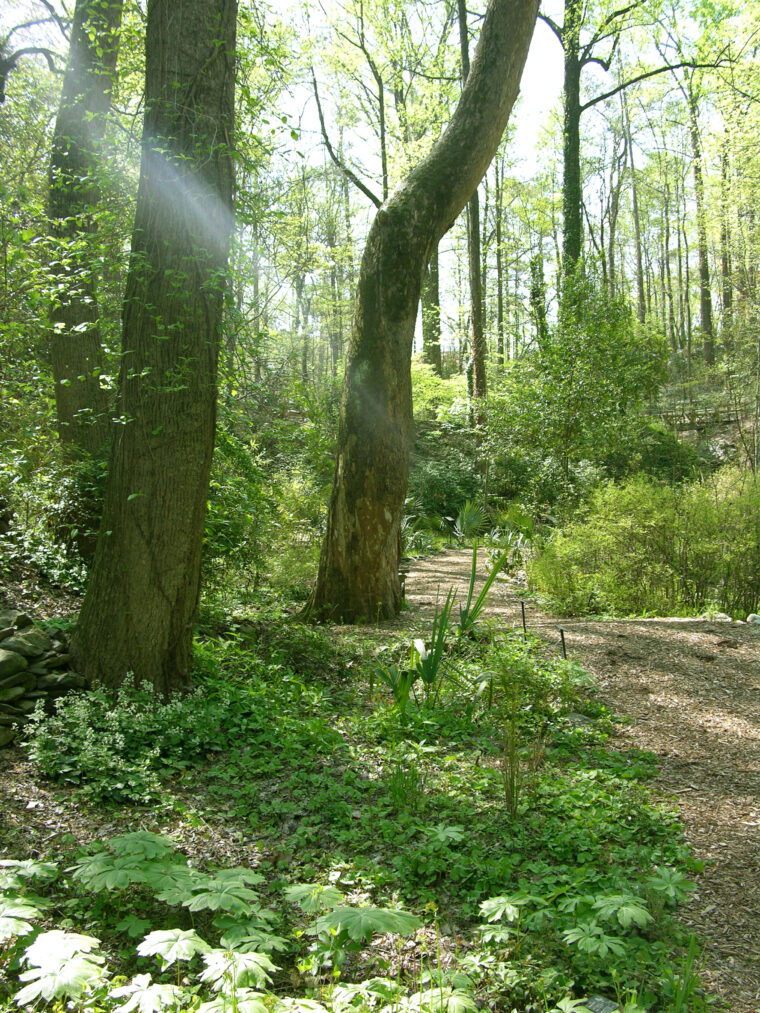 Sycamore in spring 2010. It has a natural bend in the trunk.