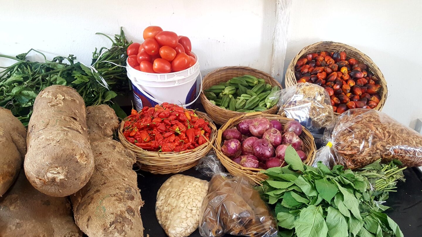 Traditional West African foods such as yams, tomatoes, onions, melons, pepper, pumpkin leaves, okra, palm kernel, crayfish, and stockfish. Bukky658, Wikimedia Commons