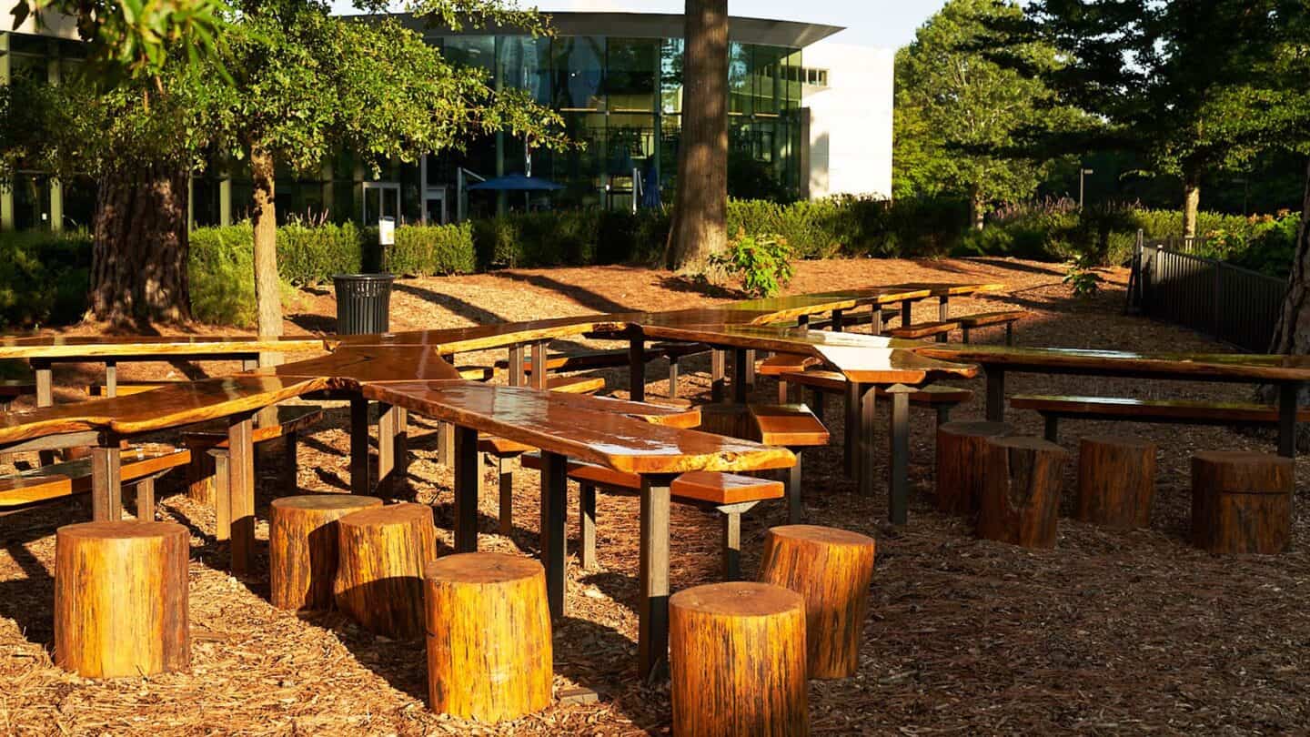 Woodworker Kirk McAlpin III spent seven months carefully crafting the table tops and benches, which span 60 x 30 feet. The result is a functional crown jewel of the Entrance Gardens.