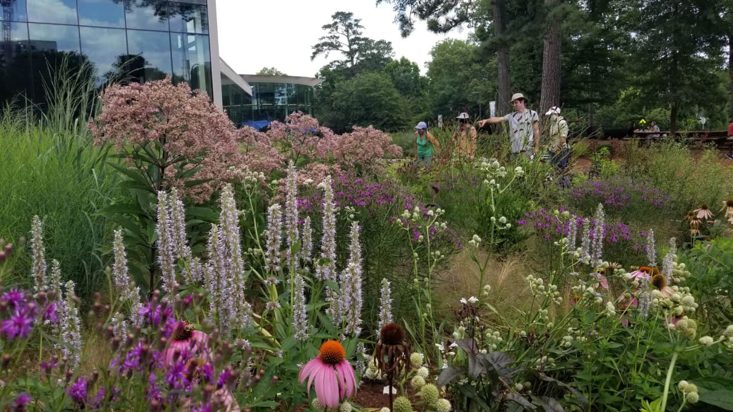 Over half of the 10,000 plants that have been placed in the Entrance Gardens so far are native to Georgia, including uncommon species that deserve wider recognition and use in gardens. Goizueta Gardens staff researched plants that support high numbers of pollinators to be used in large quantities. The result is a garden buzzing with pollinators—which also means it will attract birds who eat insects and rely on insect larvae for their young.