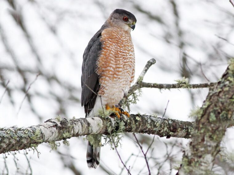 The most commonly seen hawk in the Goizueta Gardens is the red-shouldered hawk. Red-shouldered hawks live across eastern North America, with separate populations along the West Coast of the United States and in central Mexico. These hawks are creatures of dense woods. They prefer mature, wet woodlands with large trees and are often found near water. Red-shouldered hawks eat primarily small rodents, reptiles such as snakes and lizards, and frogs and toads. Red-shouldered hawks are mostly non-migratory, with the exception of some of the farthest northern populations.