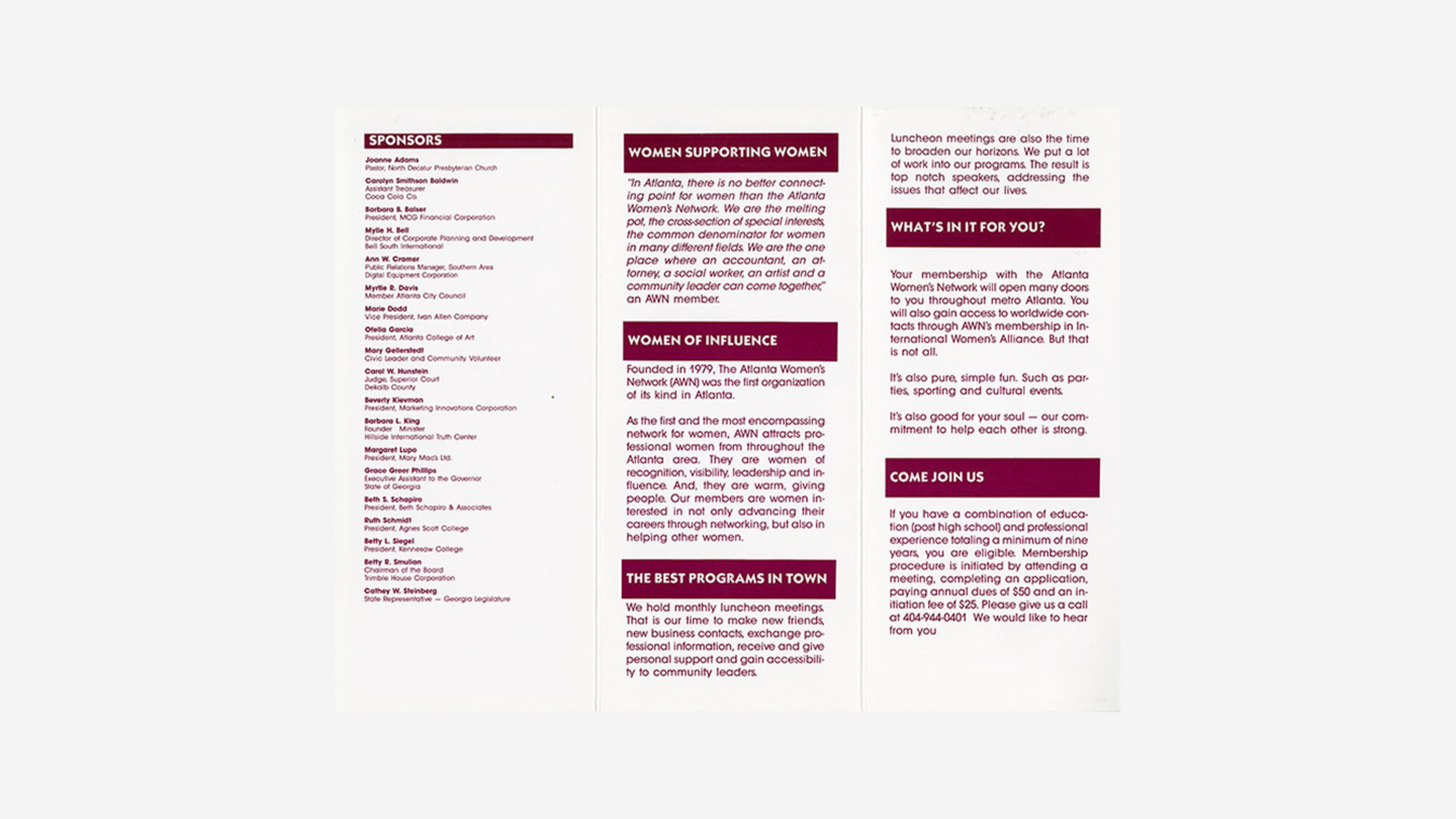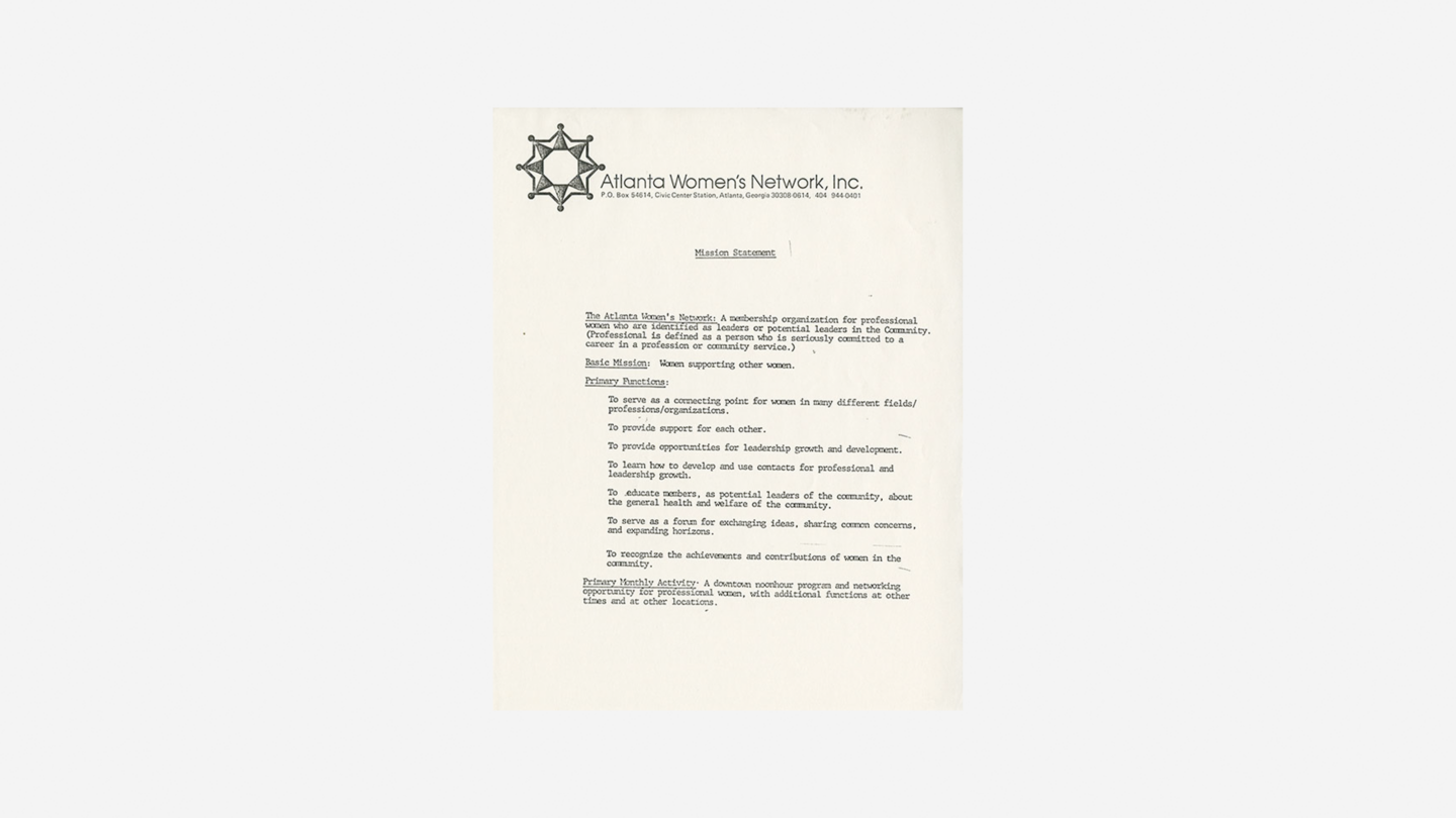 This organization’s records document the establishment and operation of Atlanta Women’s Network. Areas of the organization include the board of directors, committee creation and work, luncheon and other event planning, and business operations. The bulk of papers consist of correspondence and memos, meeting minutes, marketing ephemera, newsletters and publications, and rosters and directories.