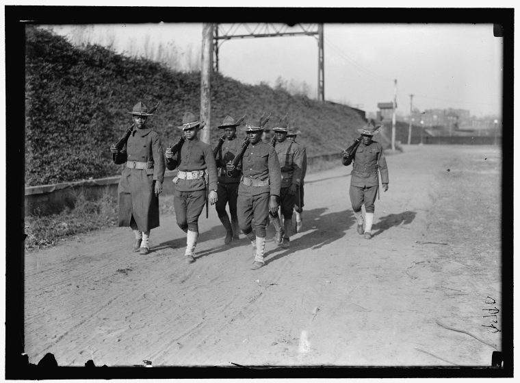 Black riflemen fall in step near Atlanta, 1917. Image via Library of Congress.